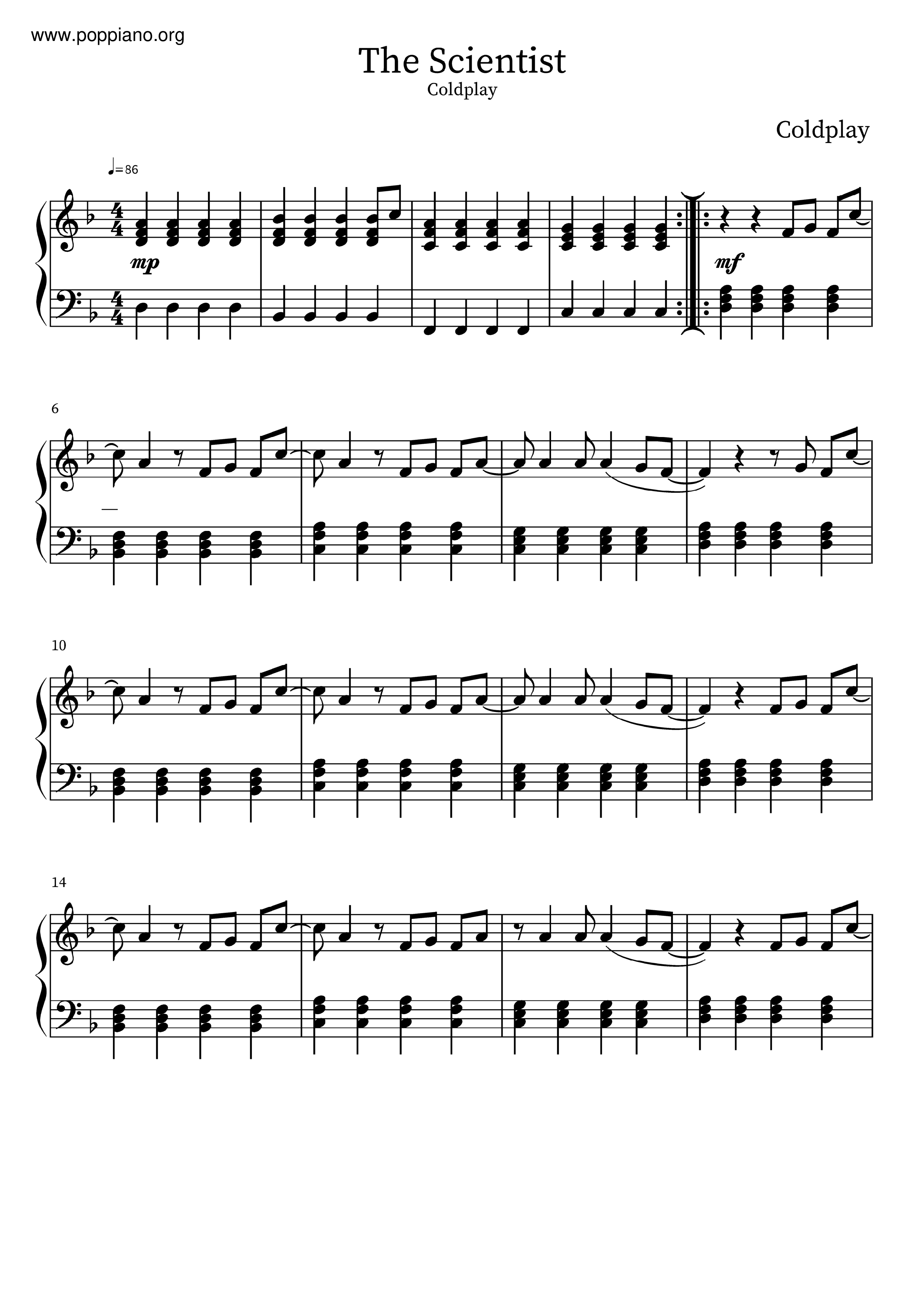 The scientist is a song by coldplay. The sheet music of the scientist is also available. If you purchased multiple copies, please print all of them. Bellow is only partial preview of coldplay the scientist sheet music, we give you 3 pages music notes preview that you can try for free. Piano sheet is arranged for piano and available in easy and advanced versions. The recommended time to play this music sheet is 04. The scientist sheet music lyrics coldplay come up to meet you, tell you i'm sorry you don't know how lovely you are i had to find you tell you i need you tell you i set you apart tell me your secrets and ask me your questions oh, let's go back to the start running in circles coming up tails. This sheet music does not have a license and is copyrighted.